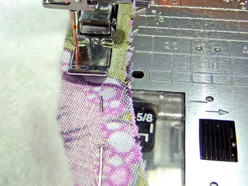 - Edgestitch across one end, pivot, then continue edgestitching up to and the past the first pin by approximately ½”.