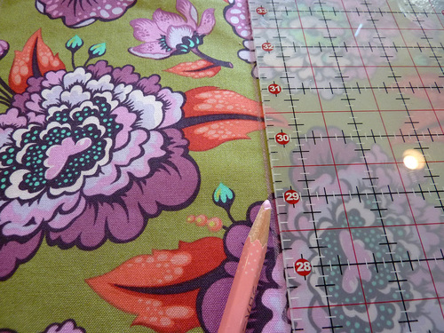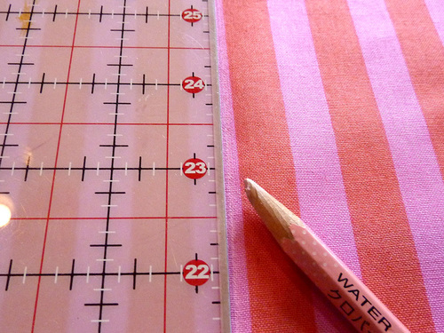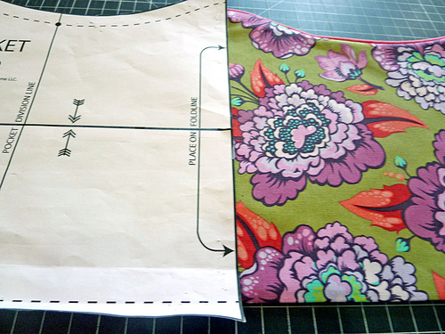 - Find the exact center of each pocket and draw a vertical guide line at this point, using a fabric pen or pencil. We used the pattern piece to insure our center mark was correct.