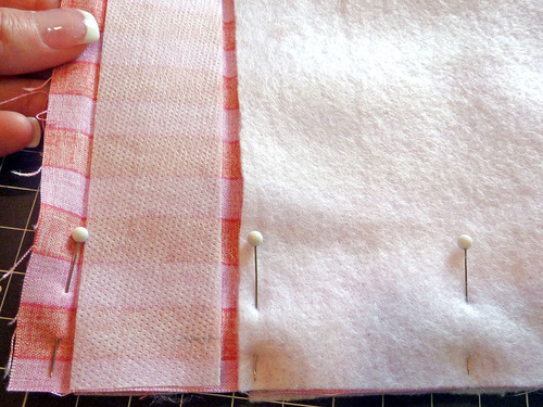 - Place each fused pocket piece right sides together with a piped pocket piece. Pin along the top and bottom edges only. The sides remain open.