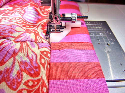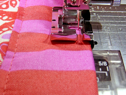 - Edgestitch around the top fold of the bag as well. We switched to our Janome Quarter Inch Seam foot for this step (never miss a chance to take the time to change to the right presser foot for the job). Press well all around.