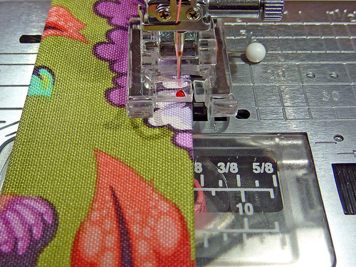 - Using a ½” seam allowance, stitch along the top and bottom of each pair. Along the top, if the piping was placed accurately as shown above, a ½” seam allowance should run right along the inside edge of the piping cord. If needed, adjust the foot and/or the needle position to keep your seam as close to the piping cord and as even as possible. We again used our Janome Zipper foot.