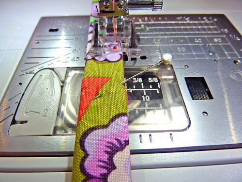 - Edgestitch from pin to pin through all the layers to secure the fold. This creates an easy-carry top to the handle. For the best finish, use a locking stitch at the beginning and end of the seam or leave the thread tails long and knot to secure.