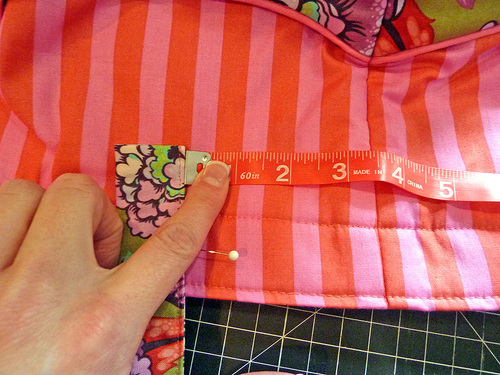 - Find the center of each handle, along the folded edges. Place a pin at this center point. Measure 4½” to the left of center and place a second pin. Measure 4½” to the right of center and place a third pin. Remove the center pin.
