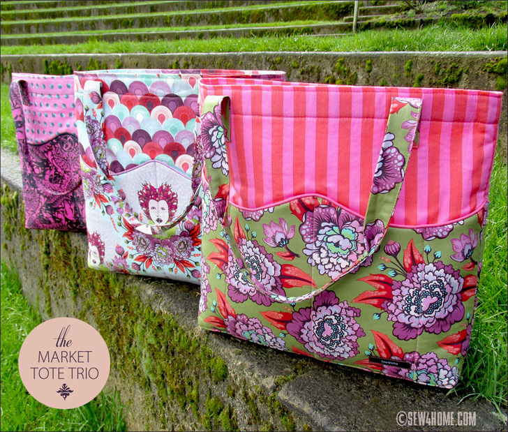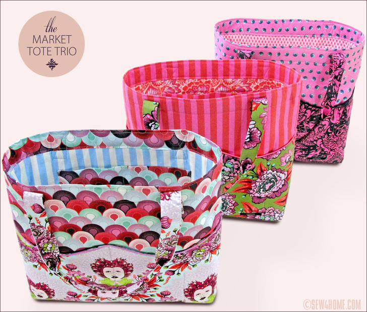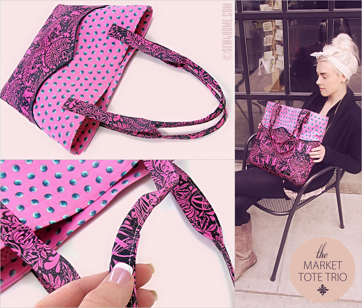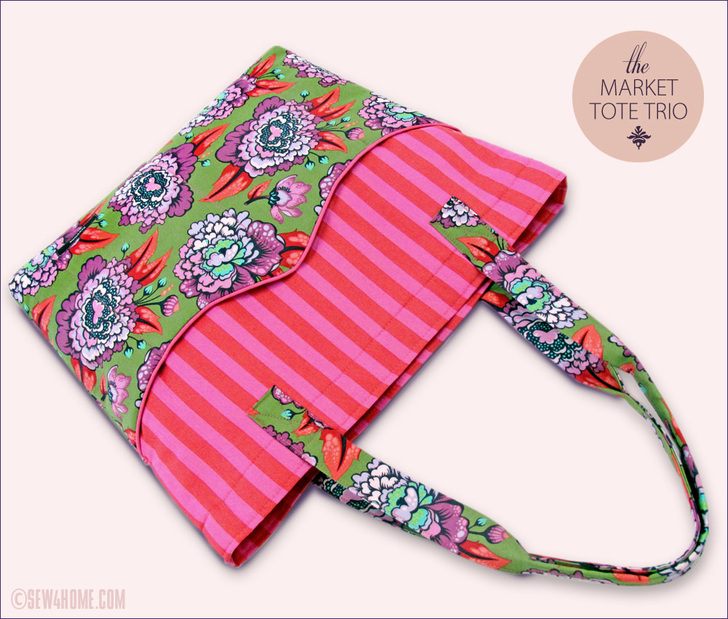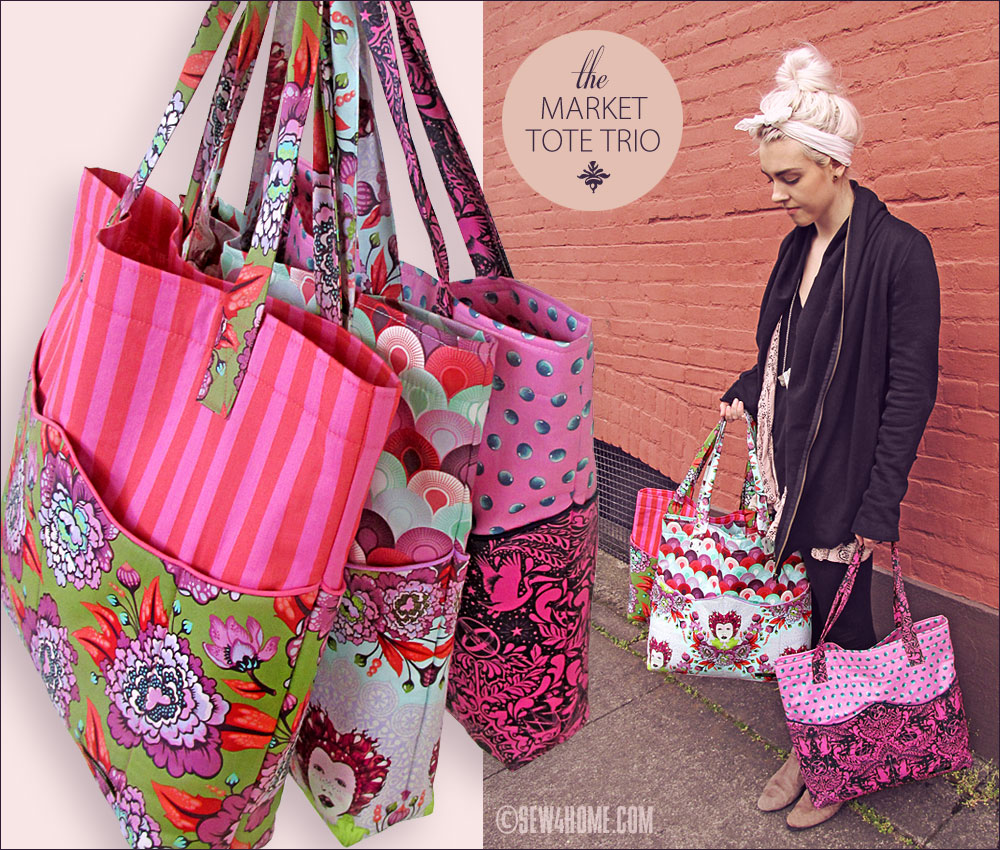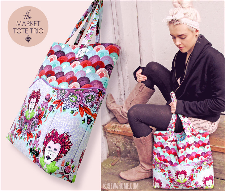eye-catch・ing, adjective: immediately appealing or noticeable. Synonyms: a trio of beautiful totes in fussy-cut quilting cottons. This is what we call a statement bag. It’s specifically designed to make the best use of the chosen fabric’s color and motif. Each bag blends three prints to create the exterior and lining. Our set is particularly striking because we made three, but one bag on its own will draw attention like no other. While shooting our sample photographs, people literally stopped us on the street to ask about them!