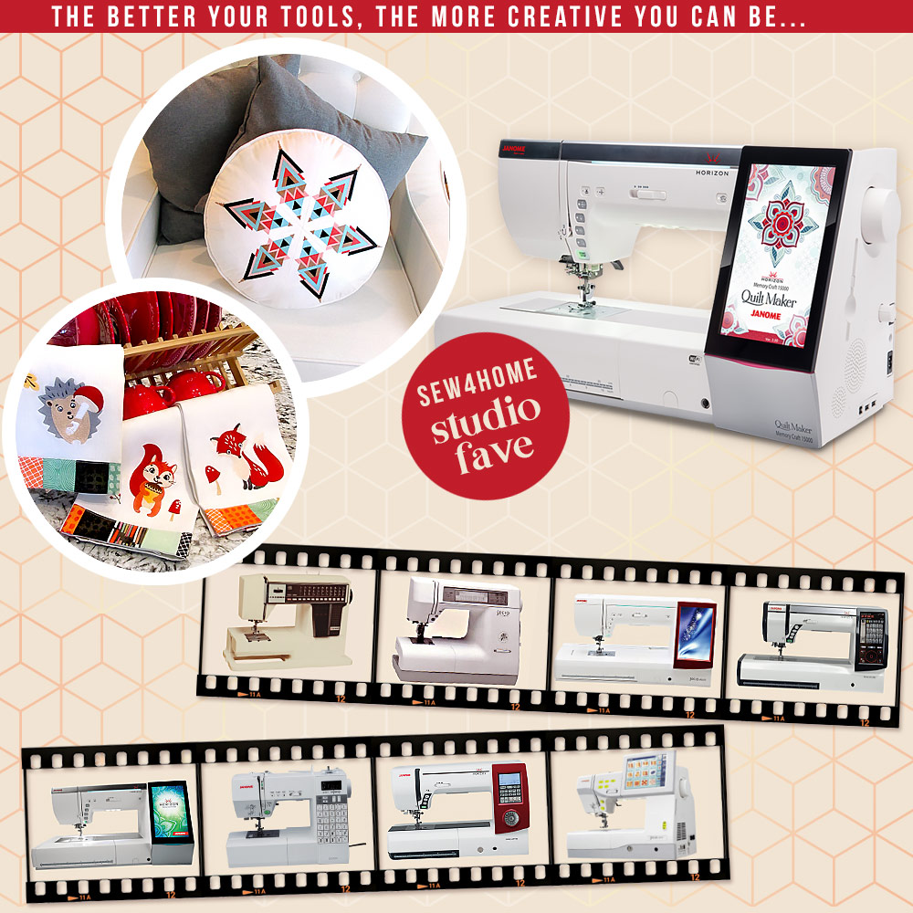 Here in the S4H studios, we are lucky to sew every day on a wide range of the most current Janome models. Some of our favorites include the Horizon Quilt Maker Memory Craft 15000, a sewing and embroidery marvel made with the designer in mind. We always laugh when folks outside of the sewing and craft world regard the sewing machine as some sort of historical artifact their grandmothers and great-grandmothers used to create clothes during the Depression. The MC15000 features wifi, five powerful apps, over 1000 built-in embroidery designs, and virtually “automatic everything.” Gramma would be blown away!