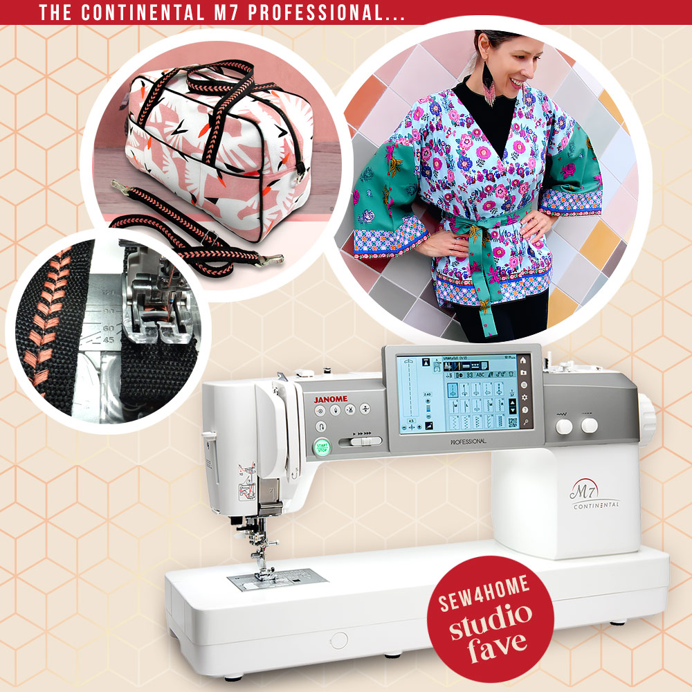 Another go-to in our S4H studios is the Continental M7 Professional with the largest sewing space available on any home use sewing machine as well as powerful penetration and needle force. We continue to be impressed by how quiet it is at speeds of up to 1300 spm with virtually zero vibration. We used the M7 for some of our most popular recent S4H projects, like the Favorite Overnight Duffle and the Kimono Style Belted Wrap.