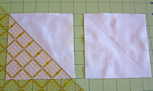 - With a fabric marking pen or pencil, draw a diagonal line across each of the 5″ squares.