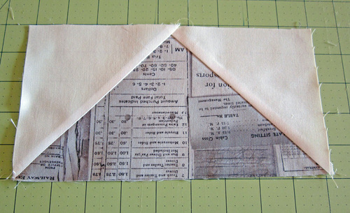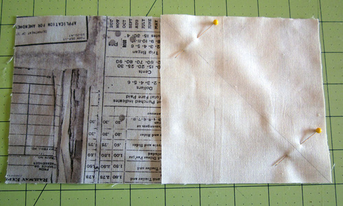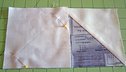 - Place one 5″ square on top of one 5″ x 9½” block, right sides together, carefully matching the top, bottom and side raw edges of both layers. The diagonal line should be oriented from the upper left to the lower right. Pin in place.