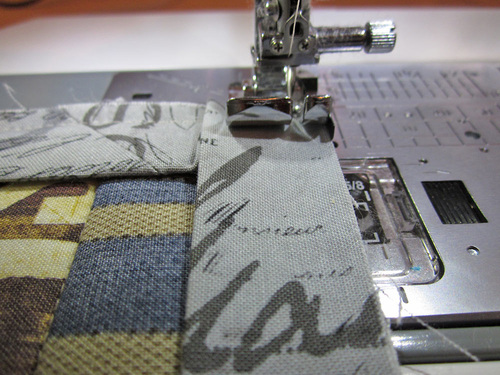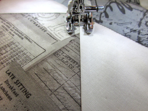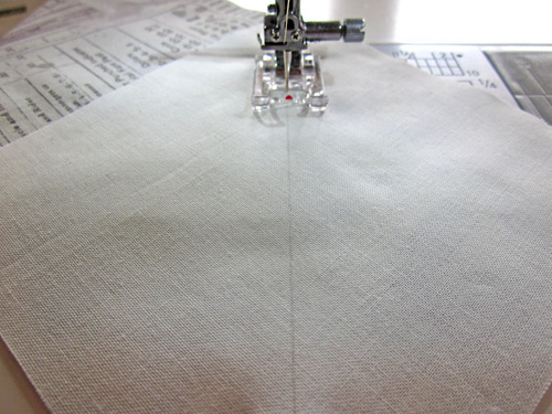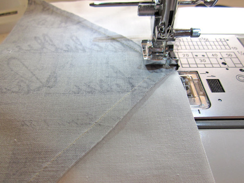 - Stitch along the drawn diagonal line, taking care not to stretch the fabric as you sew.