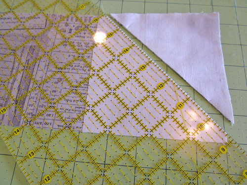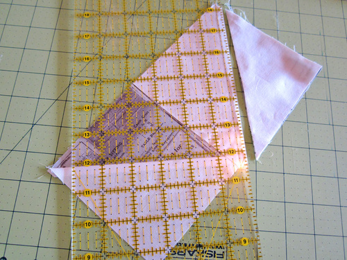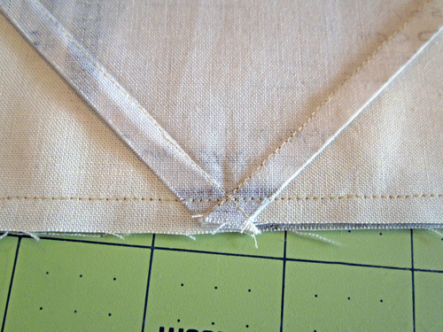 - When this seam is stitched, return to your cutting mat and trim away the corner ¼” from the line of stitching.