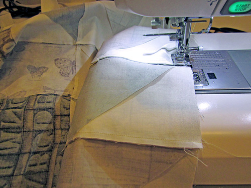 - Cut the backing fabric (NuGray in our sample) into two 47″ lengths: one WOF (width of fabric or 44″ in our sample) x 47″ and the other 16″ x 47″. Remove the selvedges from each panel. Pin the panels right sides together along one 47″ edge and sew with a ¼” seam allowance to create a large panel 47″ x approximately 58″. Press the seam allowance open and flat to reduce bulk.