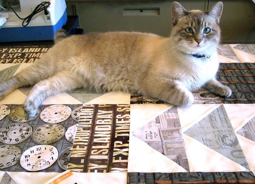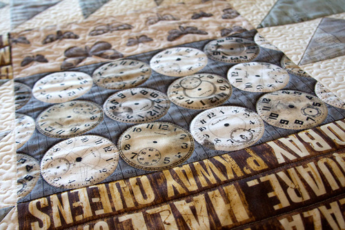 - The blocks with the Timepieces in Taupe print are quilted by stitching circles around each of the clock faces. To minimize breaks in stitching, start at one end of a row of clock faces, stitch around half of the first clock face, then switch to the opposite side of the second clock face. Stitch half way around the second clock face, then switch to the opposite side of the third clock face. Stitch around the entire fourth clock face until you complete the circle. Continue stitching the remaining half of the third clock face, then the second clock face, then the first clock face, ending back at your starting point. Repeat for each row of clock faces.