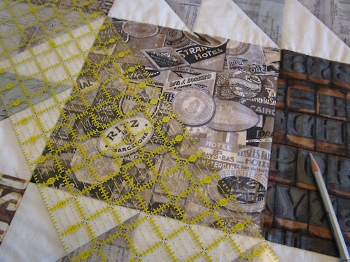 - We used an intersecting diagonal line grid on the Travel Labels in Taupe block. First mark a center line diagonally in both directions.