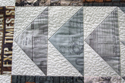 There are a number of details that elevate this project to an intermediate skill level. As mentioned above, the design is based on a traditional block called “Flying Geese.” This block requires very accurate cutting and precise ¼” seams to avoid cutting off the points when sewn into the final arrangement. The flying geese units create complex corners where multiple seams come together. The finished size of the quilt requires a seamed backing, and finally, the quilting is done sampler style, using a variety of techniques for each fabric within the quilt top.