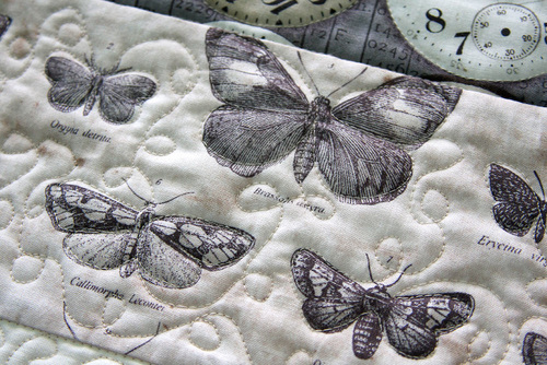 - The last areas to quilt are the Butterflight in Taupe blocks. We free-motioned quilted around each butterfly shape, following the outline, then added loops and swirls between the shapes.