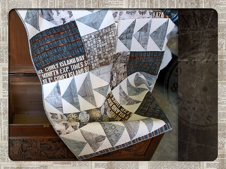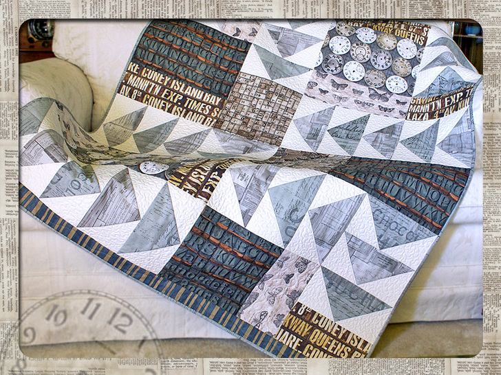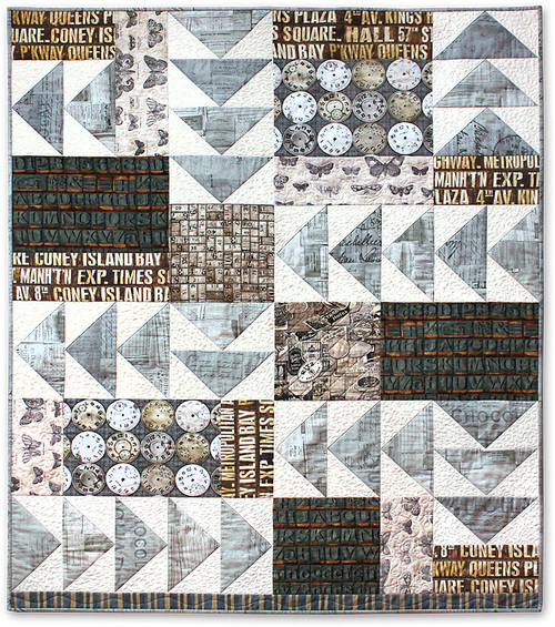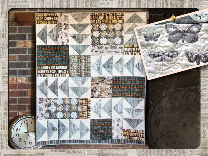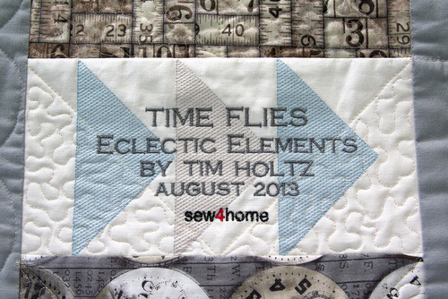Flying geese blocks, combined with the unique vintage motifs in the Eclectic Elements fabric collection, are what give this beautiful quilt its name. The variety involved is a quilter’s dream. You can isolate and piece together these interesting little bits into a wonderful collage. All the great shapes are also an inspirational bonanza for the final quilting. Sew4Home seamstress team member, Michele Mishler really went to town on our sample, outlining the clock faces and butterflies, and doing some great free-motion stippling in the solid areas. This is not a beginners quilt. If you have little or no quilting experience, you might want to first browse through our other quilt options or review our Quilting Basics series.