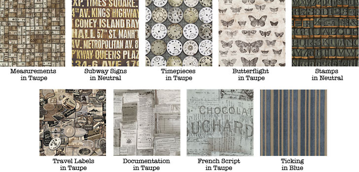 We used the following NINE fabrics from the original Eclectic Elements Collection by Tim Holtz for Coats. Use our exact cuts or experiment with your own selections.