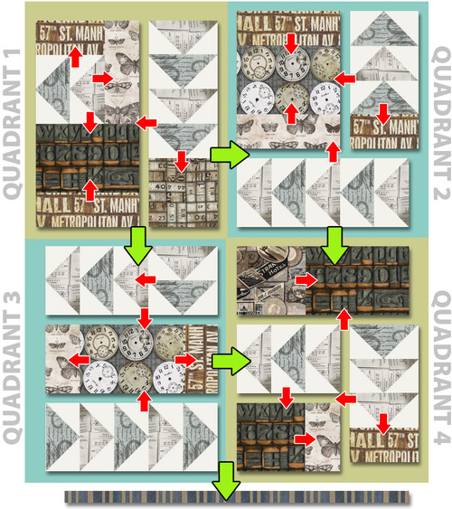 - The quilt is assembled by creating 12 large blocks, sewing these blocks into four quadrants, then joining the four quadrants and the one bottom strip to complete the quilt top.