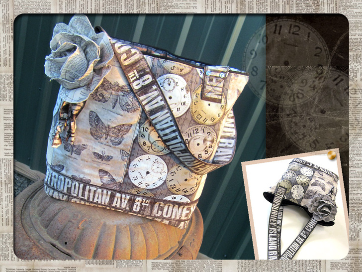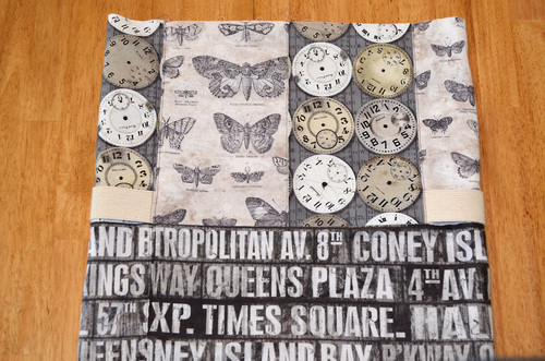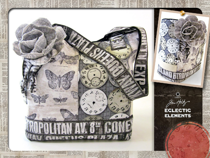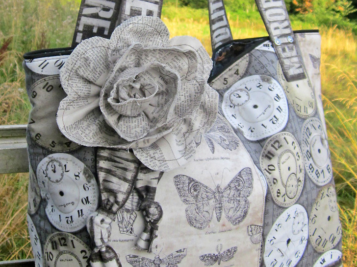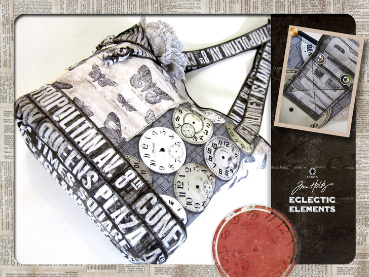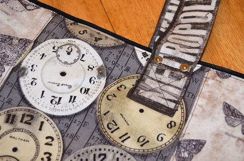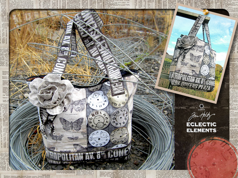 Our extra-large tote is ready for a road trip, thanks in part to the great Eclectic Elements fabric by Tim Holtz for FreeSpirit, it comes complete with great destinations built right in to the design, like Times Square and Coney Island. Fussy cutting is the name of the game in creating this bag’s special look. If you’re new to the technique, we offer a great step-by-step tutorial, but the concept is simple: carefully cut each of the fabrics to center and feature a particular motif, such as the subway stop names, clock faces and butterflies we selected from the dozens of interesting options within this wonderfully unique collection from paper-crafting guru, Tim Holtz. The front of the bag features a fabric flower as an optional embellishment, and decorative metal rivets help hold the strap ends in place and add a subtle dash of dimension.