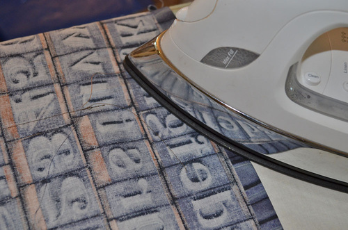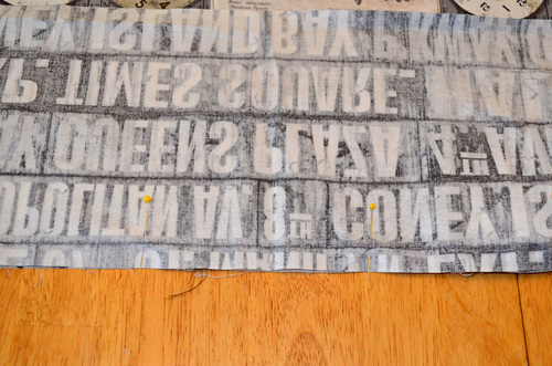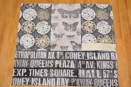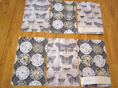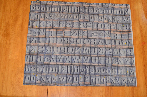NOTE: All our cuts were done horizontally to best feature the writing on the fabric; the exact measurements were tweaked a bit as needed to perfectly center the words. - From the fabric for one of the two alternating center panels (Timepieces in Taupe in our sample) cut THREE 7″ wide x 11″ high rectangles.