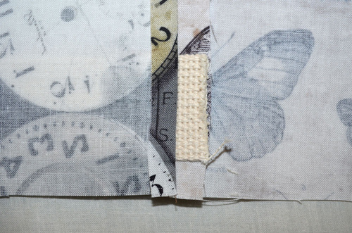 - Place the final panel (the one with the webbing) right sides together with the sewn unit, aligning the inside 11″ sides. Pin in place.