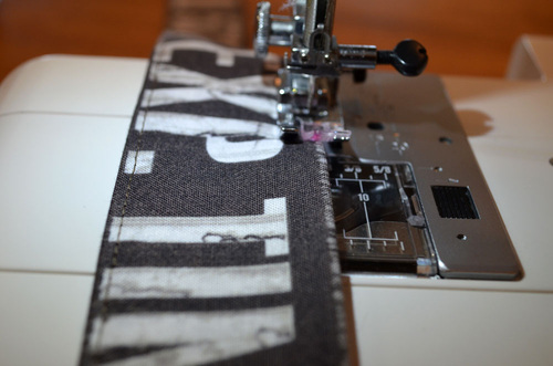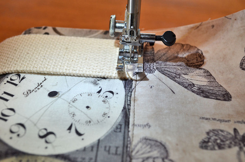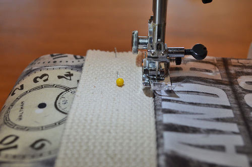 - Using a ½” seam allowance, stitch across the 19″ width. Be very careful to NOT catch the webbing in the seam. You want the bottom of the webbing to lay right along the seam, but it should not be in the seam.