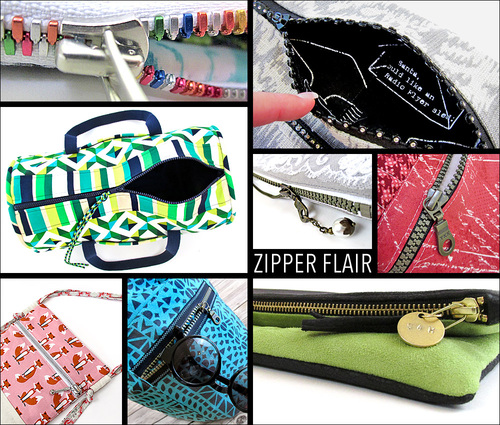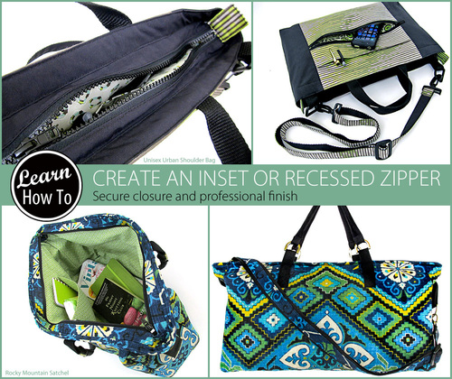 Also known as “flat top” or “set in” zippers, you’ve seen this style on loads of handbags and totes. It sits below the top of the bag, running flat across the top, featuring tabs at either end, and is secured to the bag’s lining with a simple facing, which is what allows it to be recessed. Go to the Inset Zipper tutorial.