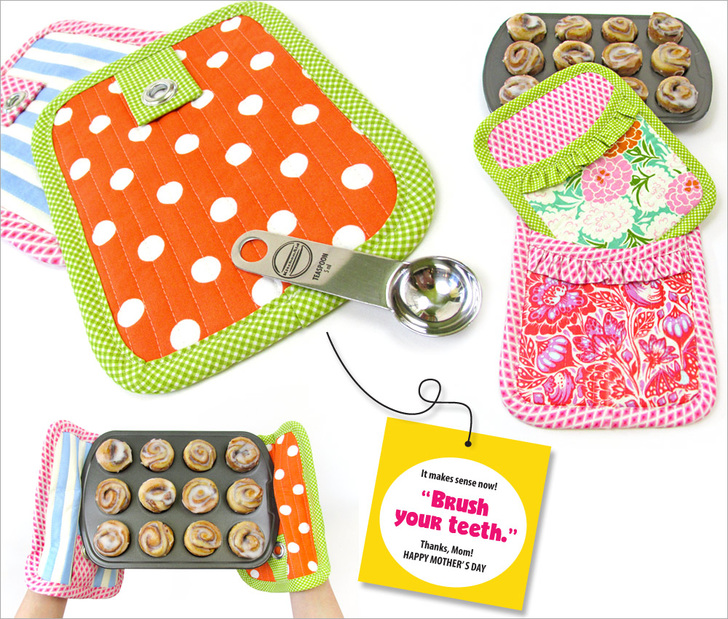 Mom deserves lots of cuteness in the kitchen! Pull out some of the prettiest, springiest fabrics from your scrap stash and blend them together into a happy mix of pattern and color. Each of these adorable mitts uses up to four different fabrics. There’s also a handy hang tab with a stylish grommet. Make up a batch of Mom’s favorite cookies (using her recipe, of course) for a sweet gift that reminds you both of days spent baking treats together and licking frosting from spoons.