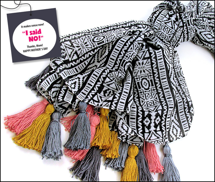 This is perfect for the best-dressed Mom (isn’t that all Moms?!). The accessory that always gives you the most fashion muscle per square inch is a big, gorgeous scarf. Ours finishes at approximately 40″ x 70″ and we show you how to make and attach a row a fancy, embroidery floss tassels along the bottom. Tassels have been around since ancient times and they still rock! Pick Mom’s favorite colors and whip up something wonderful in no time at all.