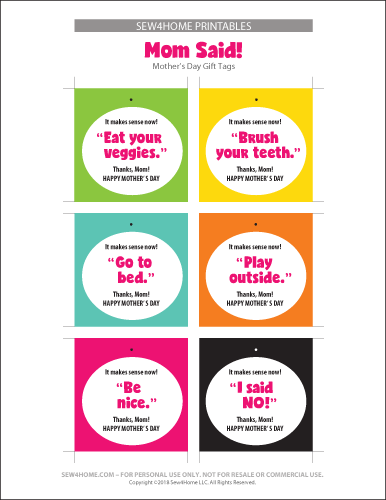 If you’d like to print our cute Mom Said! Gift Tags sheet, it is available here as a .PDF file. Click the image below to download. You will need Adobe Acrobat Reader DC, which is a free program.
