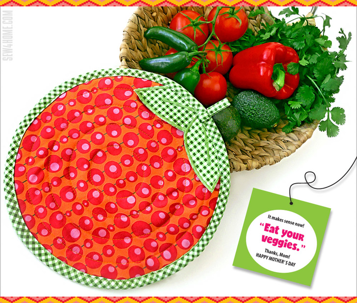 Does Mom love cooking with tortillas or flatbreads? Put your DIY skills to work to create a 100% cotton reusable warmer. Just slip in the tortilla or flatbread, close the flap, and zap in the microwave. Our adorable warmer is designed to have the look of a fresh red tomato. We show you how to add the free-appliqué leaves at the top along with a handy hanging loop. This extra finishing touch is optional, but makes the warmer so much more fun (and cuter) to have on the table.