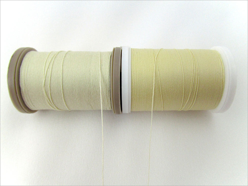 The difference in thread weights can be hard to see with the naked eye. Below are two spools of an ivory thread. On the right is an all-purpose thread, on the left is a heavy thread.