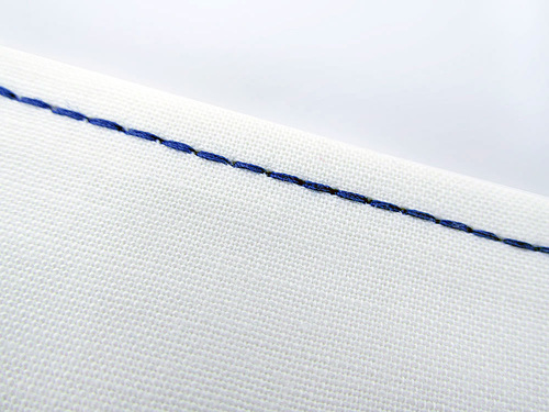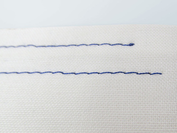 In the photo below it’s easy to see the difference in style between the top and bottom samples. The top sample shows a 2.2mm stitch and a 3mm stitch in all-purpose thread. The bottom sample shows a 2.2mm stitch and a 3mm stitch in a 12wt heavy thread.