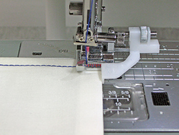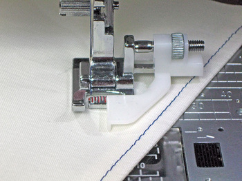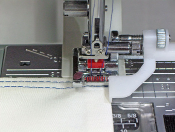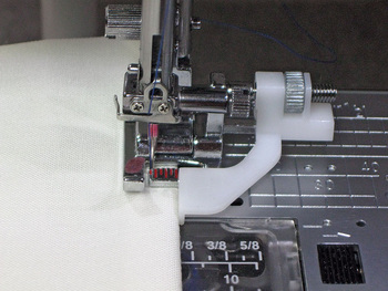 Another option for an adjustable guide is the Janome Sliding Guide foot. It has a perfectly balanced outboard guide you can smoothly slide to the right then lock into place, from ⅜” to 1⅛” from the center needle drop (10mm – 30mm).