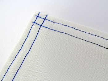 With twin needle stitching, it looks nice to sew all the way to the end. Then, remove the project from the machine and pull the top threads to the back. Knot all three threads (two top threads and the bobbin thread) to secure. Reposition the fabric under the needle to create a crosshatch at the corner, and continue stitching.