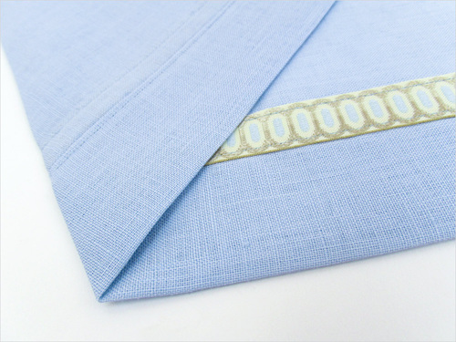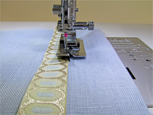 A Blind Hem foot can also work quite well for edgestitching. In the sample below, we turned up a 2″ hem then added ribbon trim to the right side. The needle was moved to the left position so the Blind Hem foot could guide the line of stitching along the edge of the ribbon.