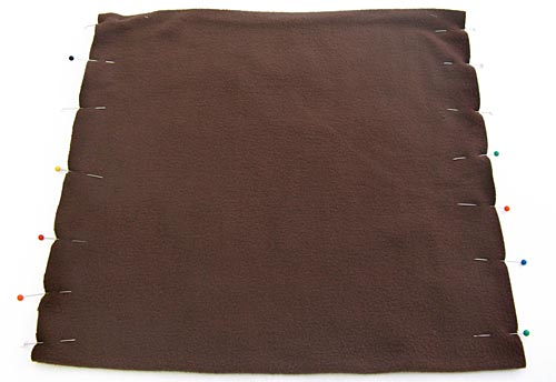 1. Fold the fleece lining right sides together matching all the raw edges. Pin in place along both sides.