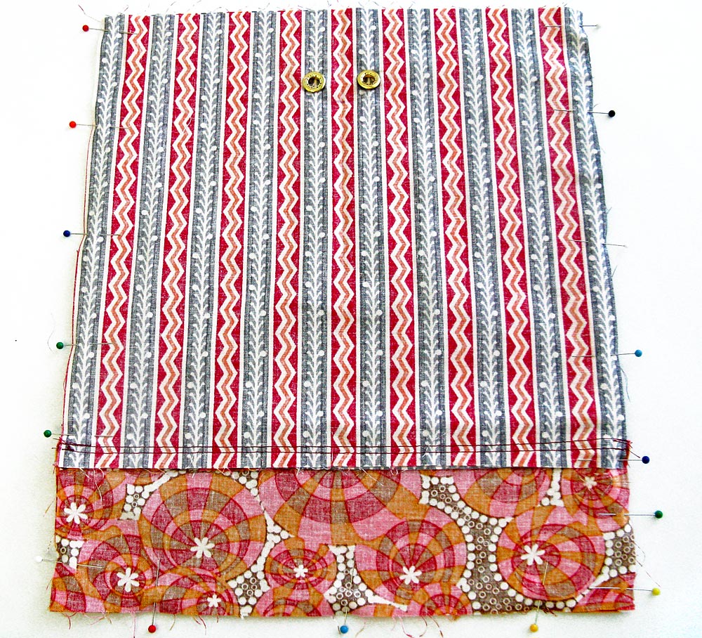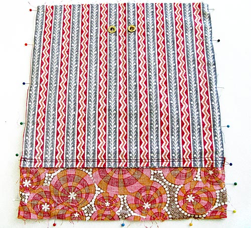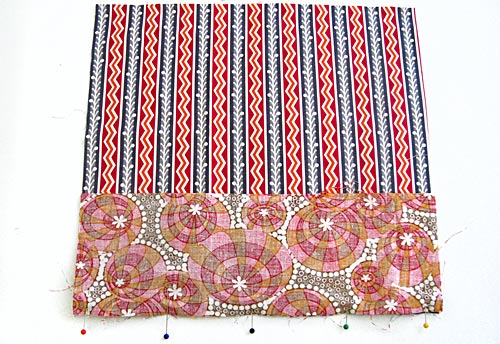 3. Place one bottom exterior piece over the flange, aligning the top edge of this piece with the bottom edge of the other print fabric piece, and sandwiching the flange in between. Your two print fabrics should be right sides together. Pin through all layers.
