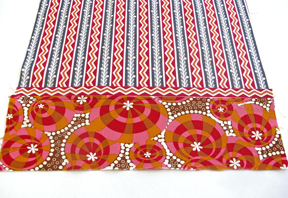 6. Flip over and top stitch, very close to the seam within the bottom panel fabric (the Loulouthi Butterberry in our sample). This secures the seam allowance in place. Press again from the right side.