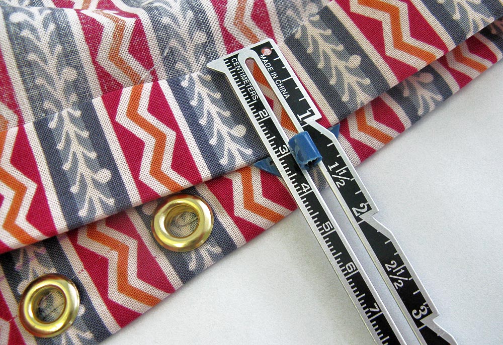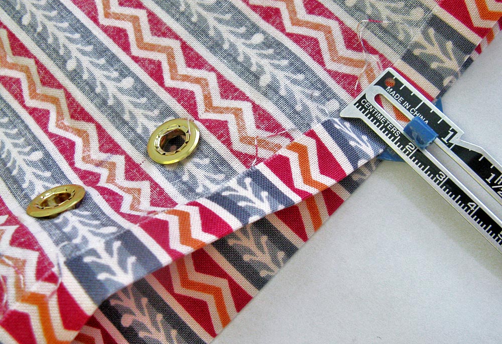 5. The grommets should be centered within this 1″ channel, one on either side of the center line. I think it’s easiest to place the actual grommets on the fabric and use both my seam gauge and my eyes to center. I decided the inside edges of the grommets should be about ½” from the center line within a stripe motif.