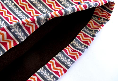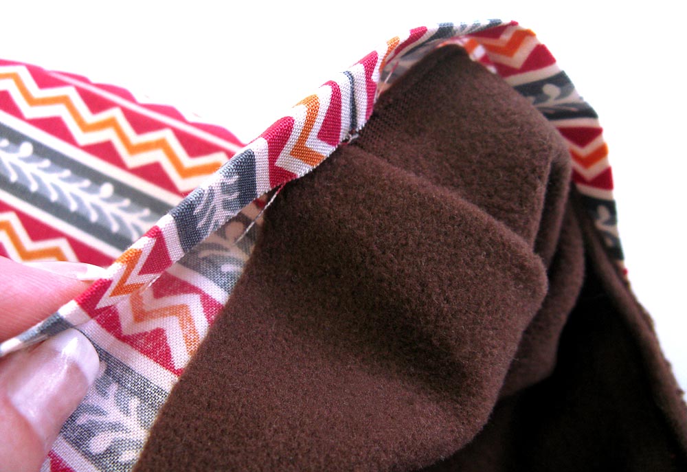 8. Slip the lining inside the exterior bag; the lining and the exterior should now be wrong sides together with that nice soft fleece showing. Push the lining down into the bag so the corners match.