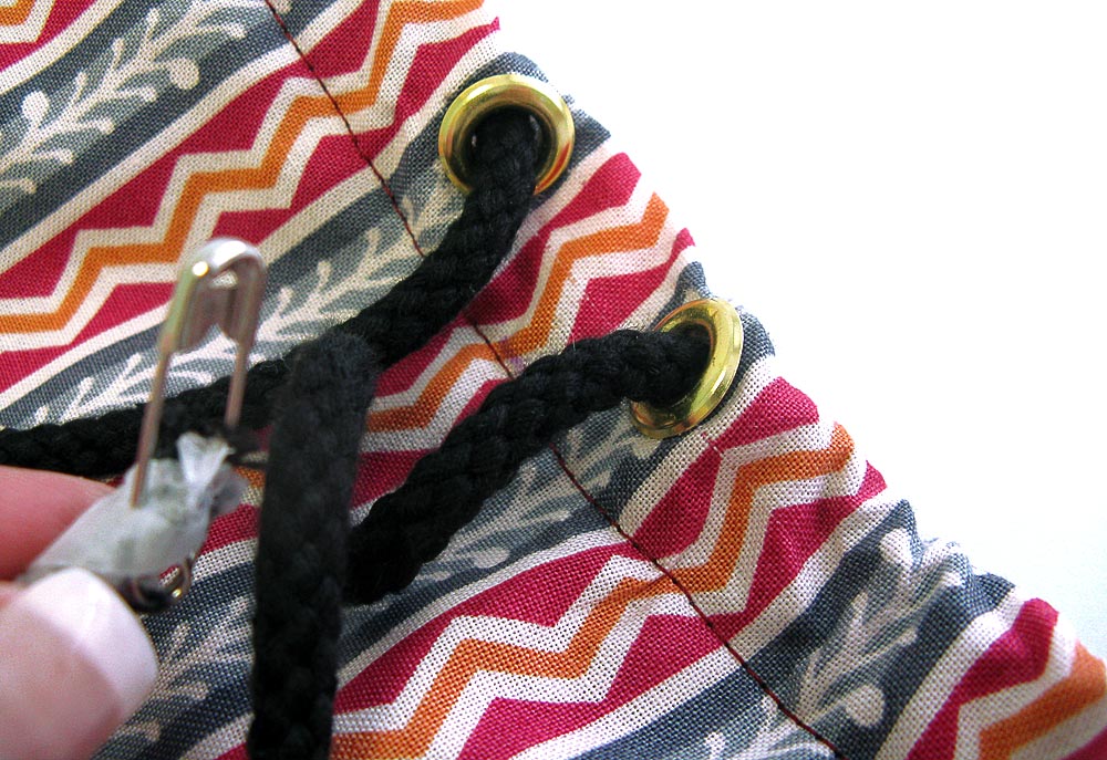 11. Stitch all the way around 7/8″ from the top folded edge of the opening. Using this top folded edge as your guide is the surest way to end up with a nice straight and even seam along the front of the bag. If you have pressed and measured accurately to make the casing, there should be no problem catching the hem along the inside. The 7/8″ width of the casing also allows you to just clear the bottom of the grommets with your presser foot.