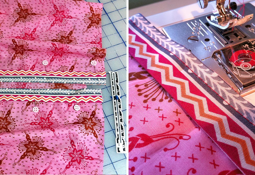 - With the main Body face up, pin and then baste a folded Inset to both 17″ ends, aligning raw edges as shown below.