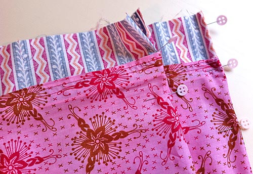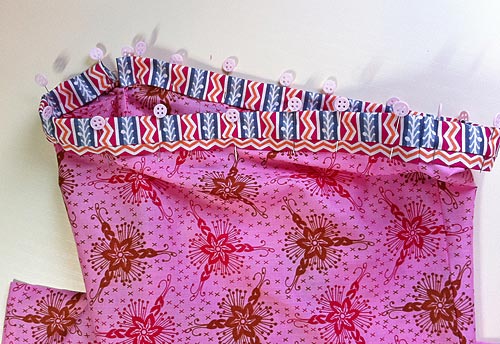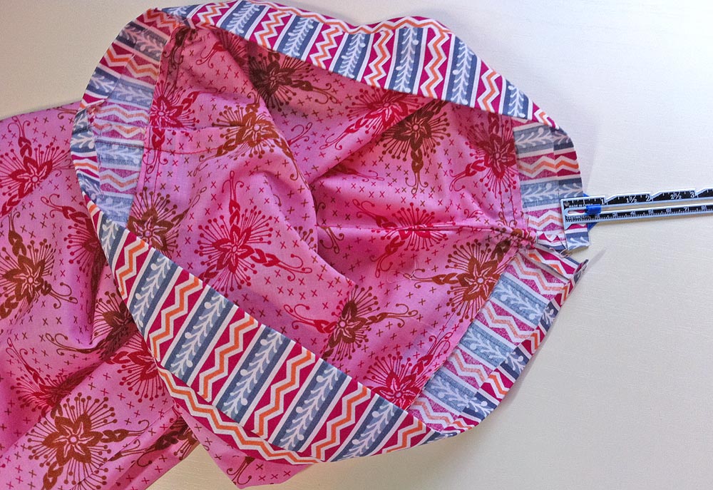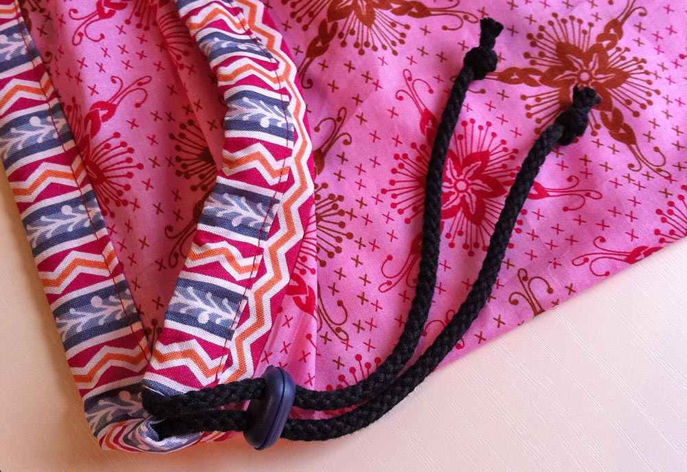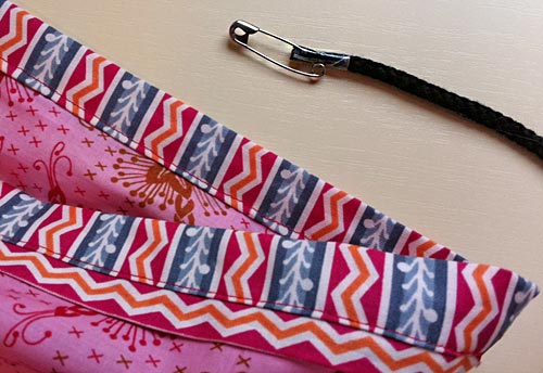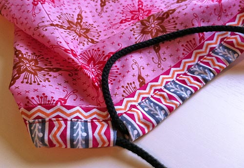 - Fold and press the top down so its folded edge covers the inside top seam. Pin in place all around, remembering that you have an opening at the one side seam, which you need to insert your cording.