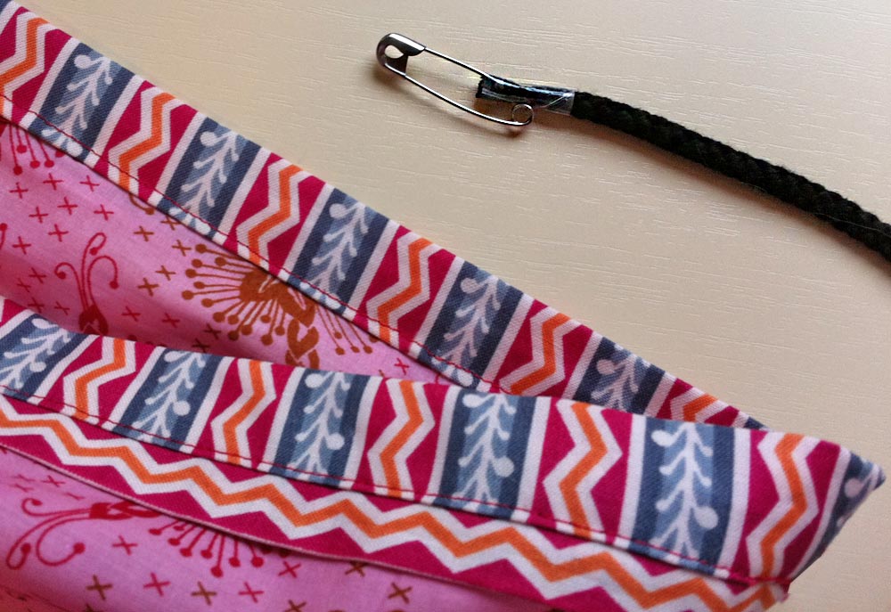 - Attach a large safety pin to one end of the 1½ yard length of cording. It helps if you wrap the end with tape, as shown.