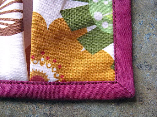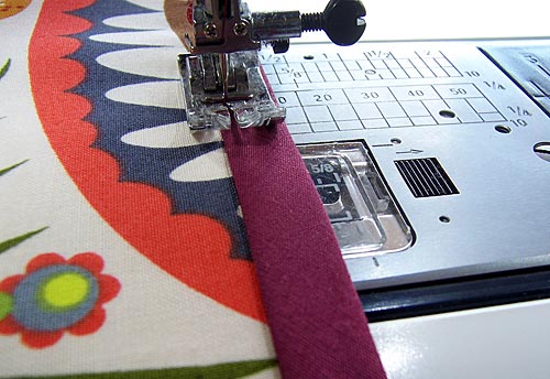 NOTE: Because our binding is fairly wide and the edges mostly straight, we went for the fastest method of binding: simply slipping it over the raw edges and edgestitching in place. If you are new to binding, there are a number of methods. Here are some of our tutorials and projects, which might help if you need a little extra step-by-step info: