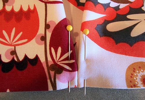 - At each of the three marks (center, left and right), create a line of pins, starting at the lower edge of the pocket. Work toward the upper bound edge of the pocket, keeping the fabric straight.