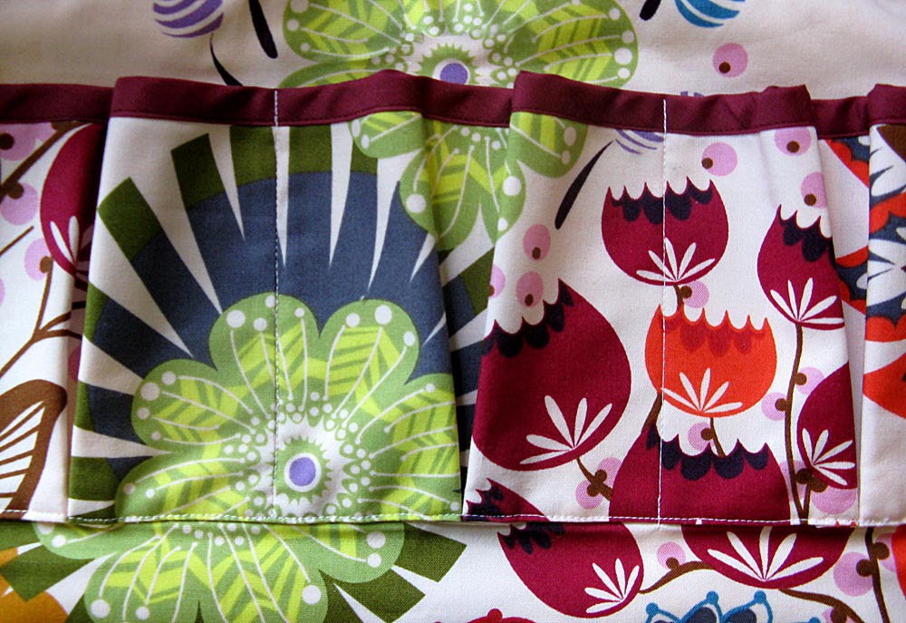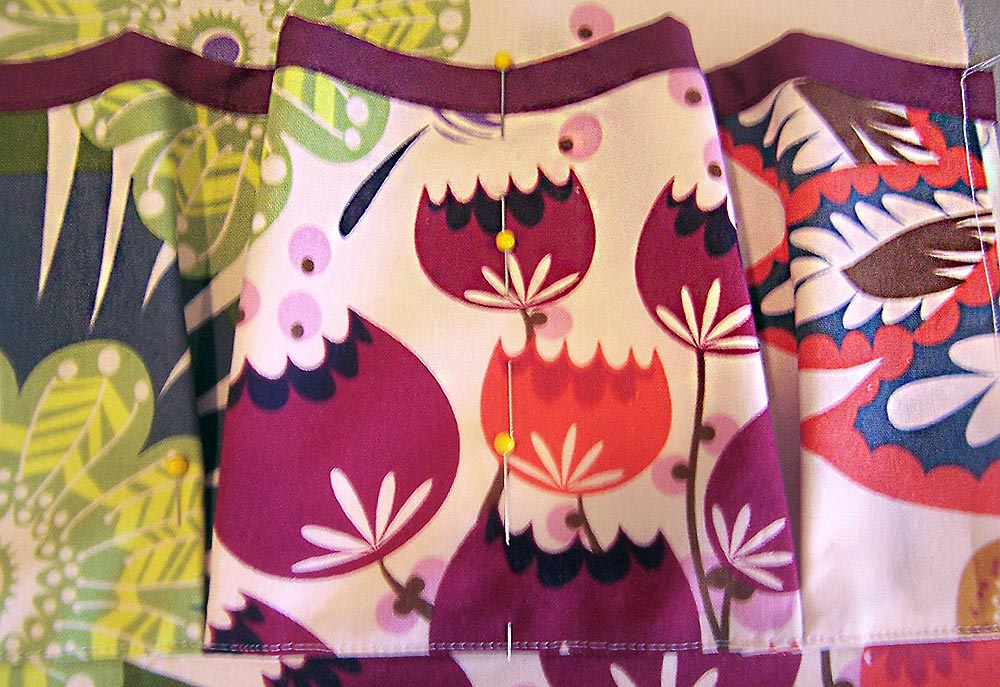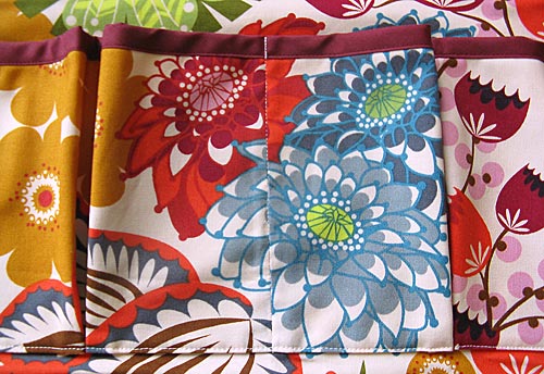 - Use the same measurements to create the lower row of pockets, aligning the lower edge (the folded edge) of the pocket with the lower raw edge of the caddy.