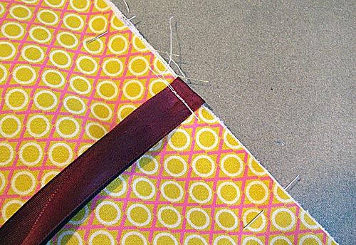 - Fold the ribbon in half and baste the folded edge to the caddy back at the top center.