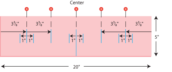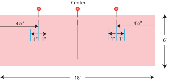 - You should still have your center, inner left and right pin/marks from your original marking and measuring above. After pleating, the center mark is still in the center and each of the outside marks should be approximately 4¾” from the outside raw edge of the pocket panel – one 4¾” from the left, one 4¾” from the right.